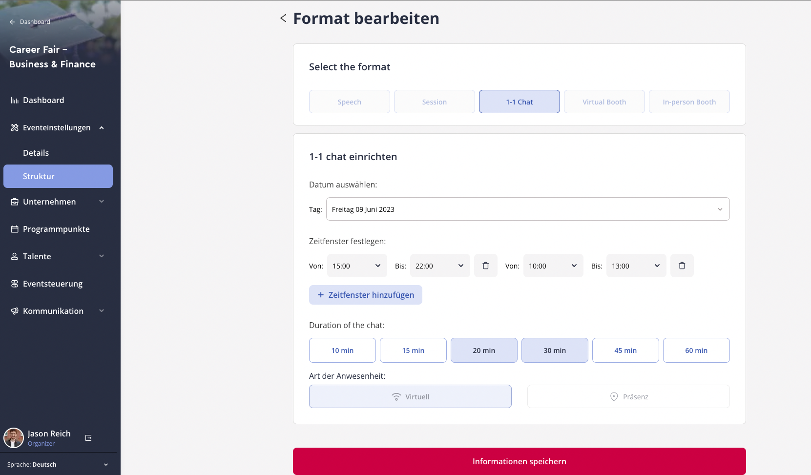 Nach dem Speichern können Sie diese Schritte für andere Veranstaltungstage wiederholen, an denen Sie 1-1-Chats veranstalten möchten.