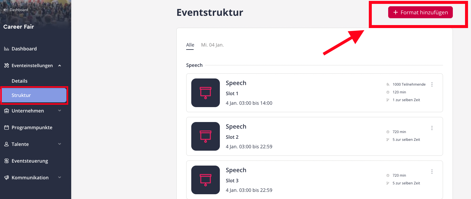 Um 1-1 Chats in Ihrer Veranstaltung zu erstellen, navigieren Sie zu "Struktur" unter "Veranstaltungseinrichtung" und wählen Sie "Format hinzufügen".