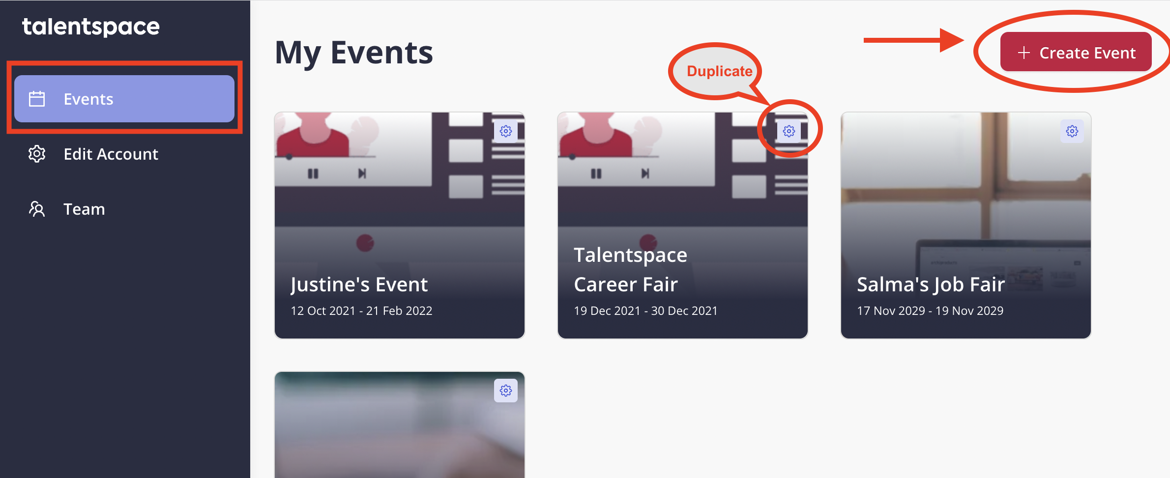 By clicking on the settings icon of one of your events in this overview, you will be able to duplicate an event.