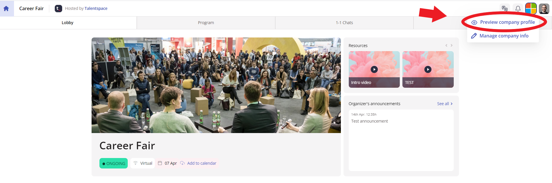 Once you have set up your company profile, it is possible to see a preview from the talents' point of view. To see the preview, go to the event you are participating in and click on the company logo, "Preview company profile" in the top right corner of your event dashboard.