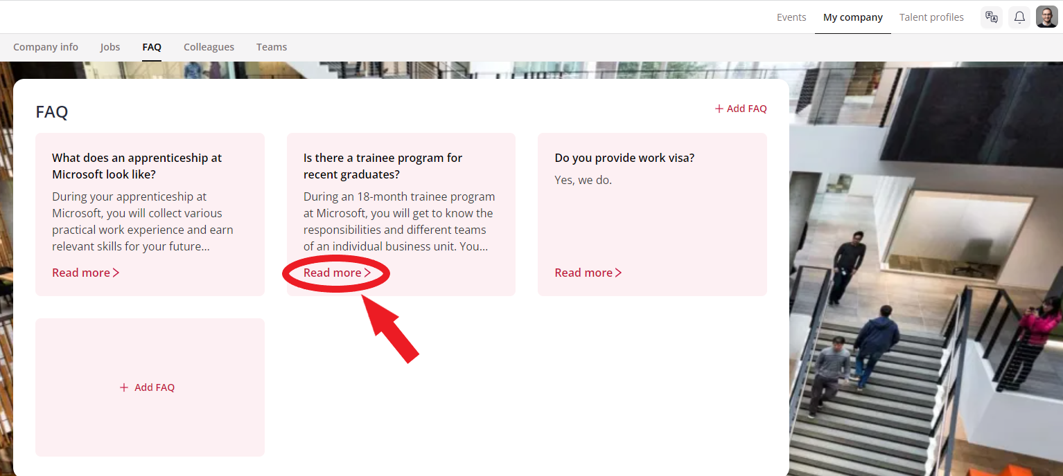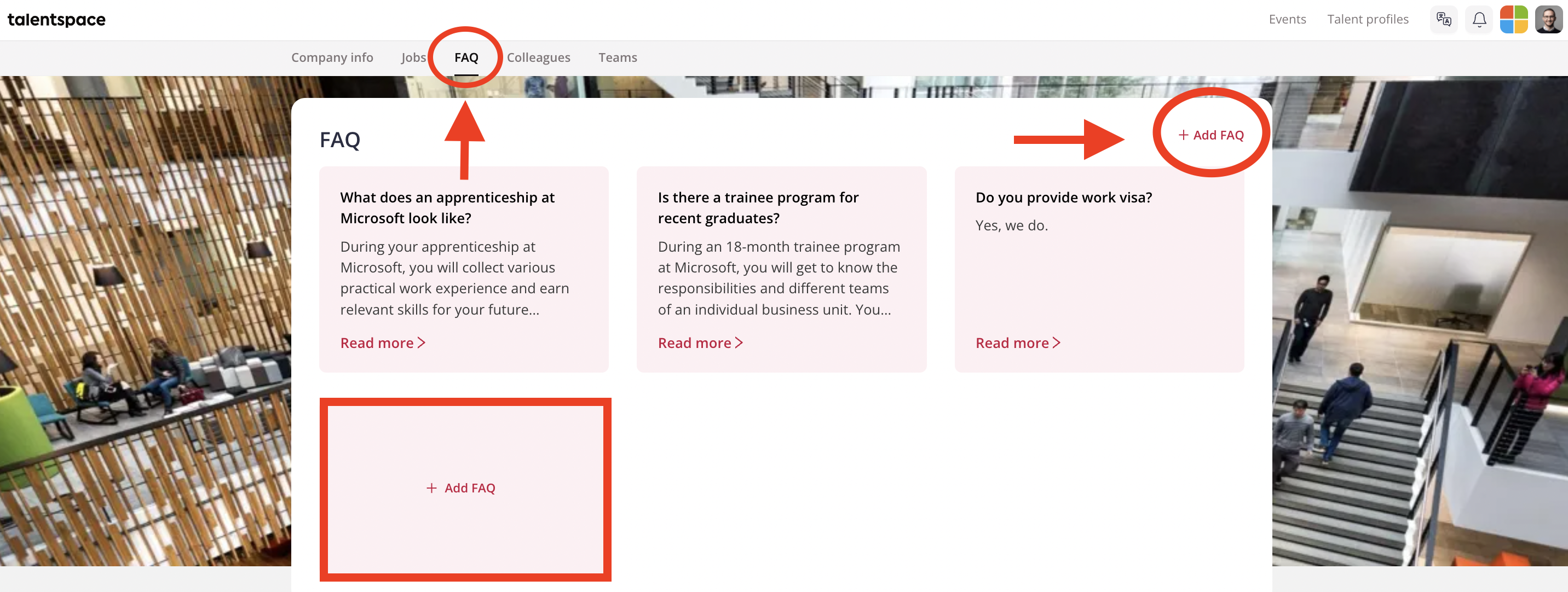 The FAQ section allows you to anticipate the popular and common queries potential hires will have about your company. Talents will use this as a resource before reaching out to you and your team members and/or posting questions on the Q&A board. Find out how to add FAQs to your company profile with these simple steps.