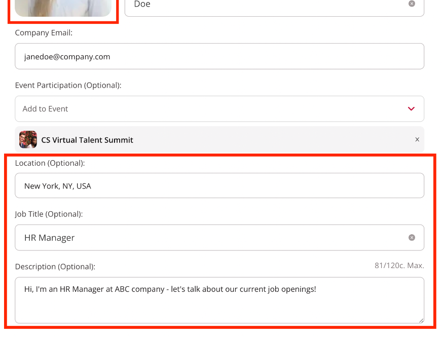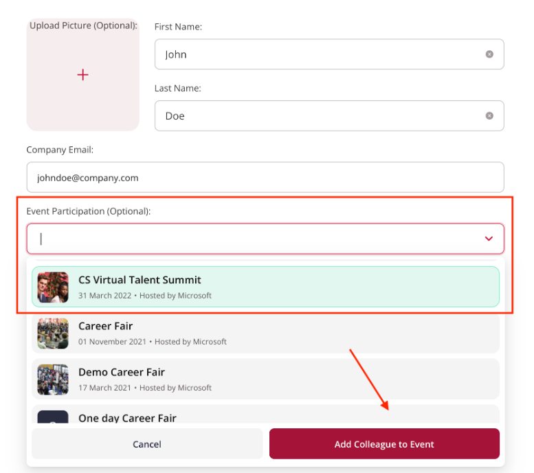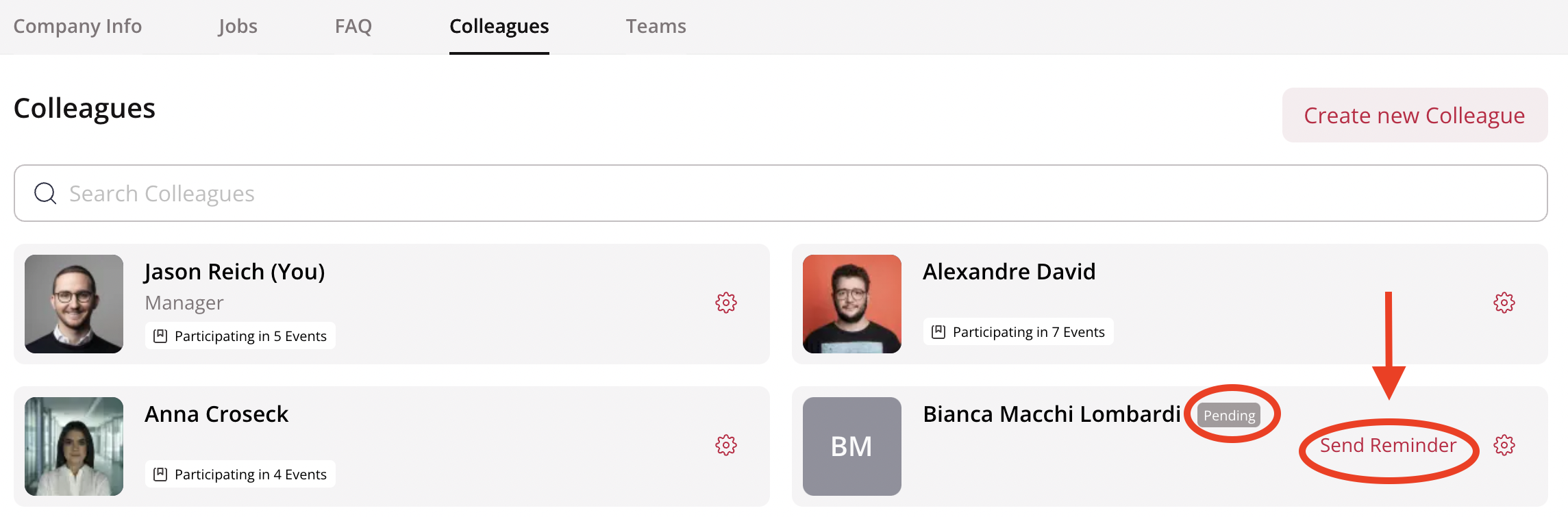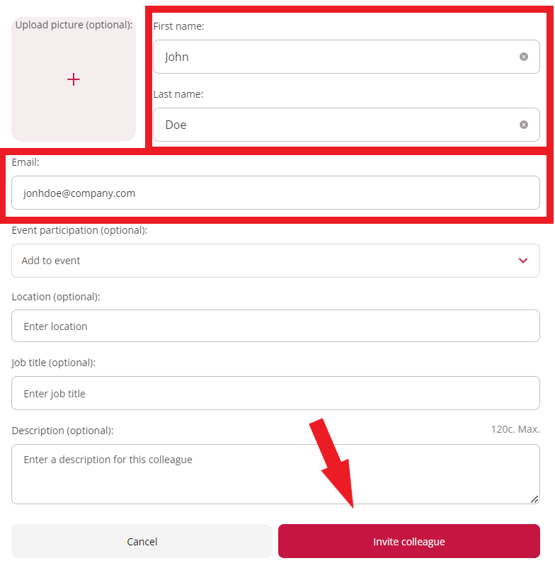 If you would like to manage your colleagues' profiles for them, you can also upload their picture, add them directly to events, and fill out their location, job title and description for them.