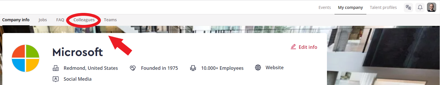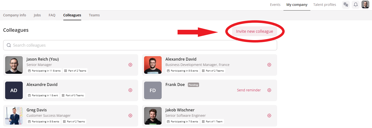 Upon logging into your account, click on your company's logo at the top navigation bar and click on the "Colleagues" tab.