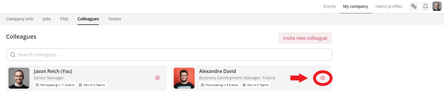You can resend and delete invitations, edit the profile, revoke a colleague’s access to your company profile or (re)assign colleagues to different events by clicking on the more options button next to each colleague's name.