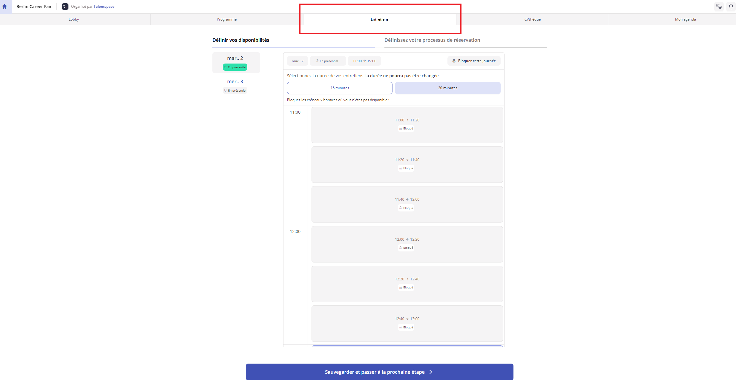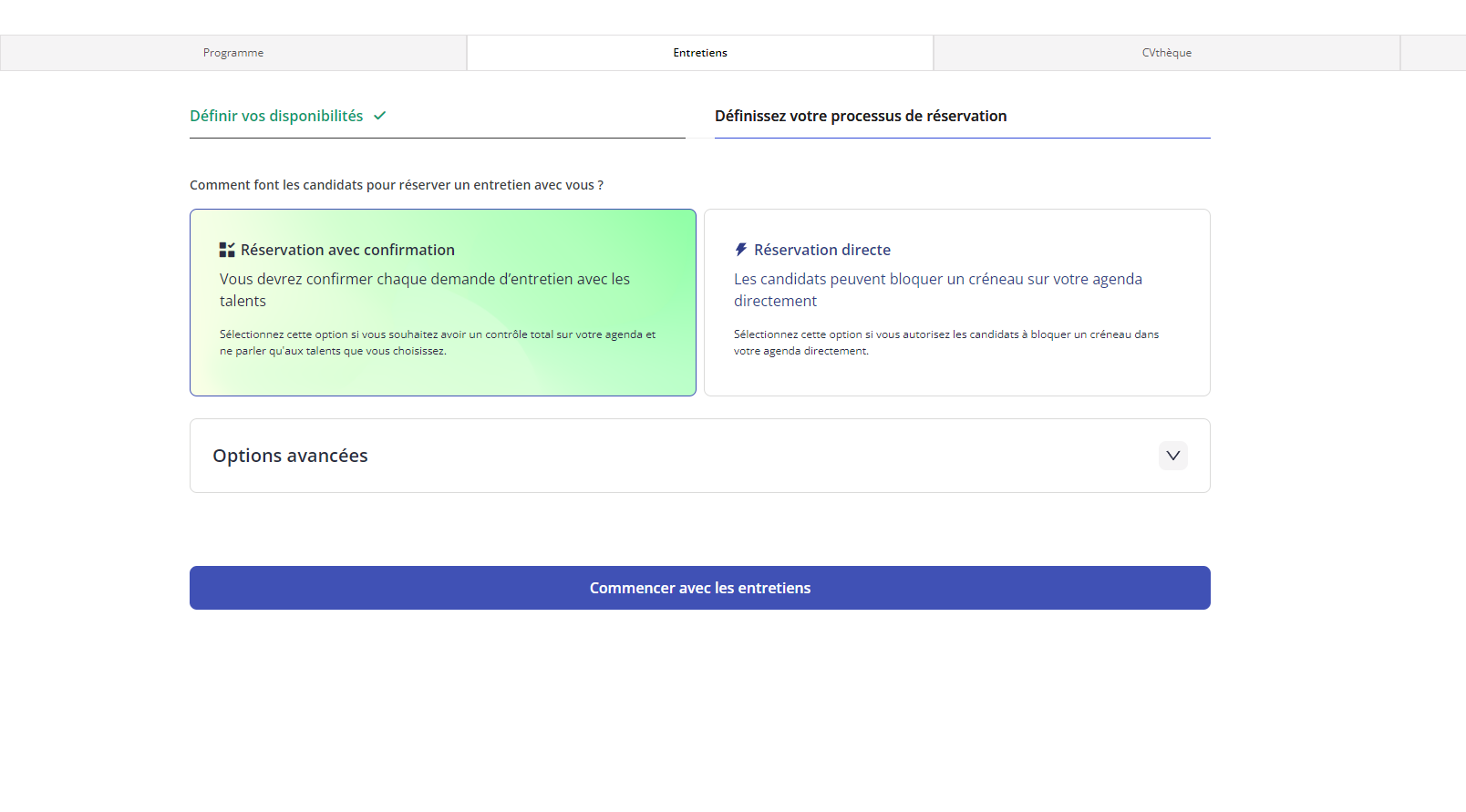 Si c'est la première fois que vous cliquez sur l'onglet entretien, vous serez invité à sélectionner vos disponibilités.