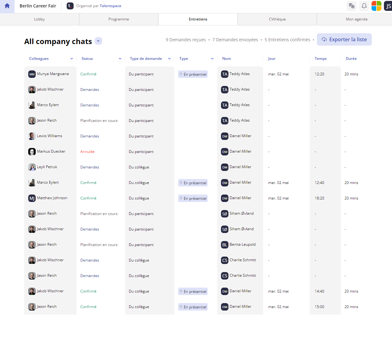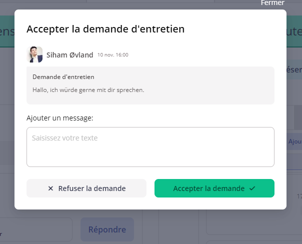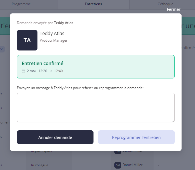À partir de cette liste, vous pouvez gérer les demandes d'entretien de vos collègues en les acceptant, en les annulant ou même en les reprogrammant.