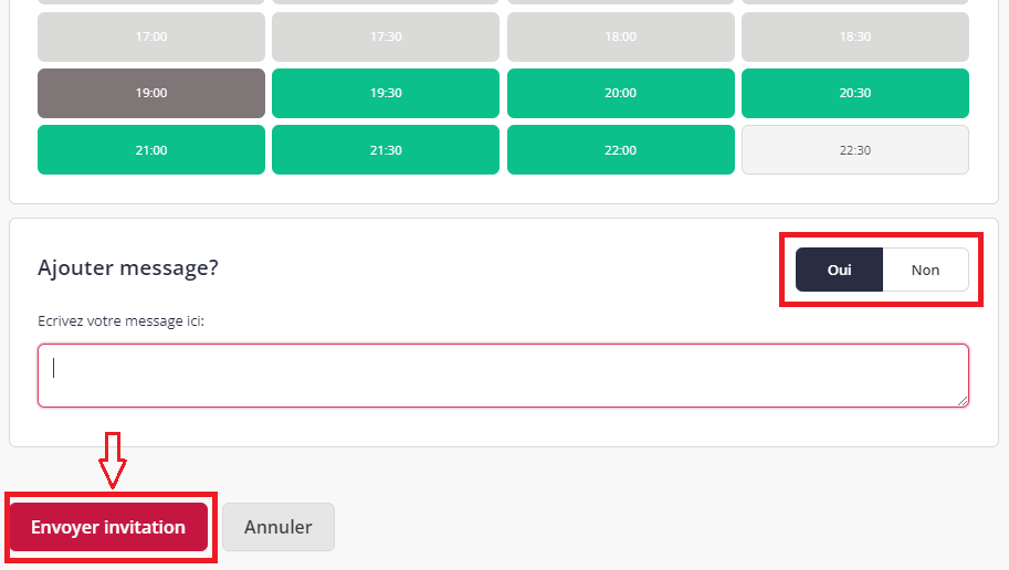 Avant d'envoyer votre demande d'entretien, vous avez la possibilité de mettre à jour votre disponibilité pour l'ensemble de l'événement une fois à nouveau. Vous pouvez également inclure un court message avec votre demande en cliquant sur "Oui" dans la section "Ajouter un message".