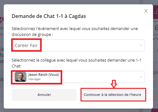 Sur leur profil, cliquez sur "Demander un entretien" sur le côté droit. Ensuite, choisissez l'événement pour lequel vous souhaitez demander le chat, ainsi que la personne avec laquelle le chat aura lieu (vous pouvez programmer un chat pour vous-même ou choisir de demander au nom d'un collègue). Ensuite, cliquez sur "Continuer à la selection de l'heure".