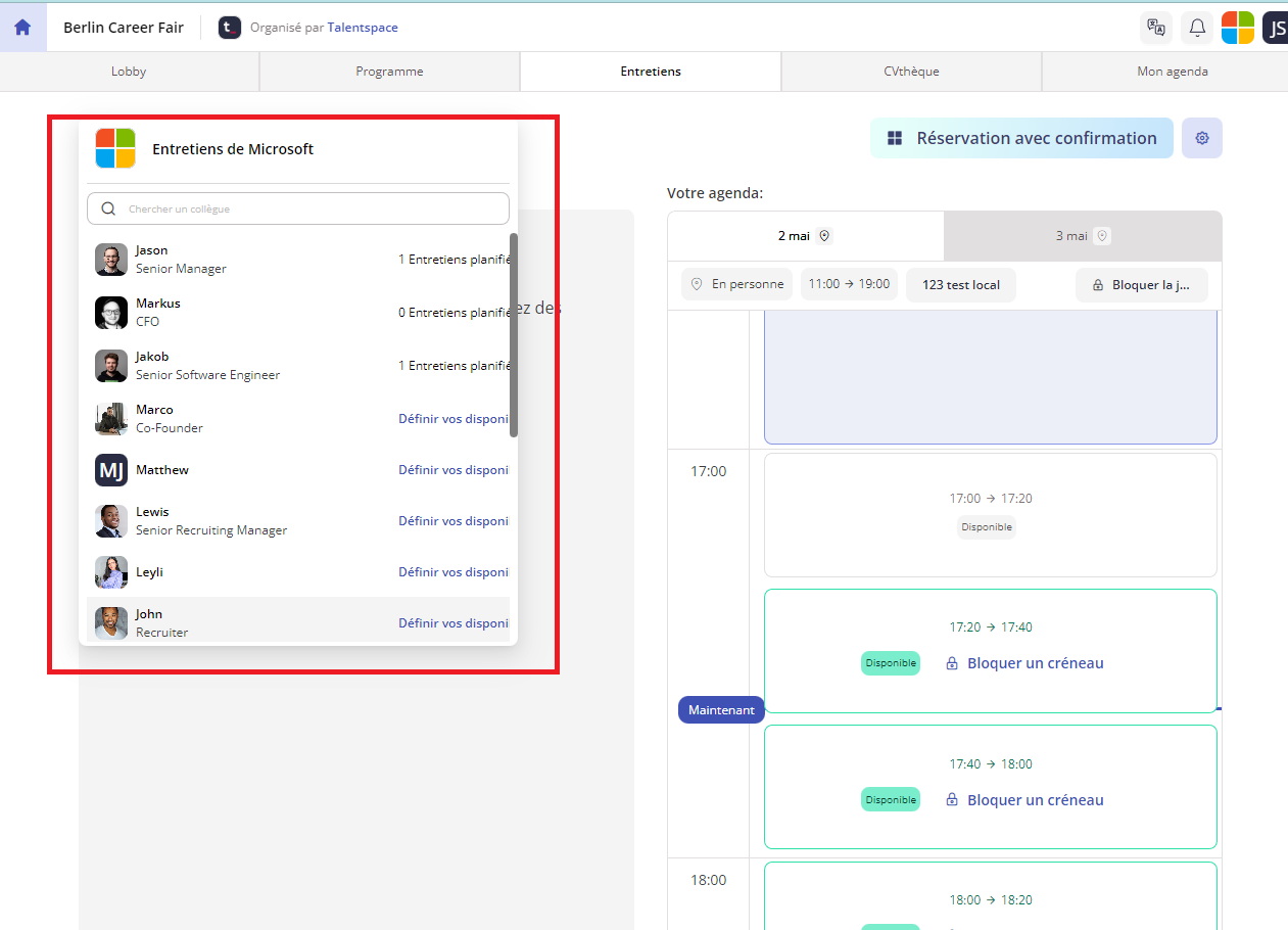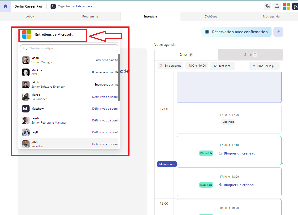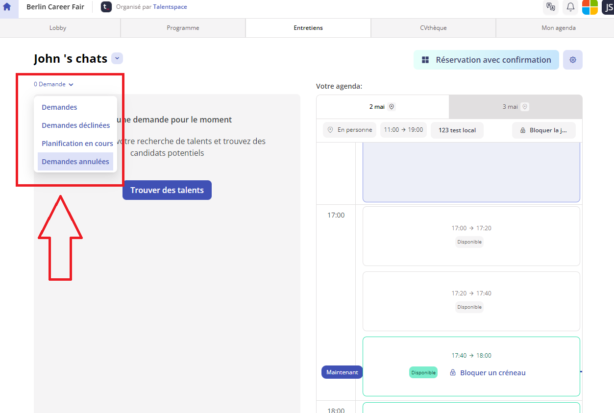 En vous connectant à votre compte, cliquez sur l'événement auquel vous participez. Ensuite, ouvrez l'onglet "Entretiens".