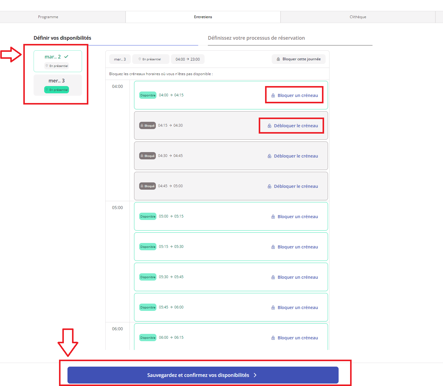 Il est très important que vous le fassiez. De nombreuses autres fonctions de la plate-forme sont liées à vos disponibilités, et si vous ne les définissez pas et ne les enregistrez pas, vous rencontrerez des problèmes plus tard.