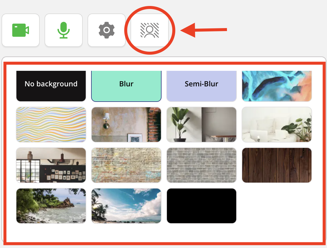 Vous pouvez également choisir parmi plusieurs arrière-plans virtuels, ou encore choisir de rendre votre arrière-plan flou ou semi-flou. Pour ce faire, il suffit de cliquer sur l'icône des arrière-plans virtuels en bas de votre écran. Veuillez noter que vous ne serez pas en mesure de télécharger des arrière-plans personnalisés.