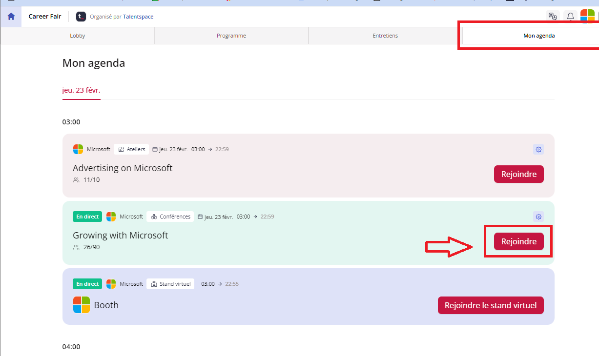 La meilleure façon de rejoindre un de vos points de programme pendant un événement en direct est d'utiliser l'onglet "Mon agenda".