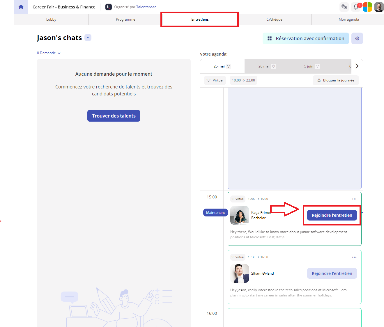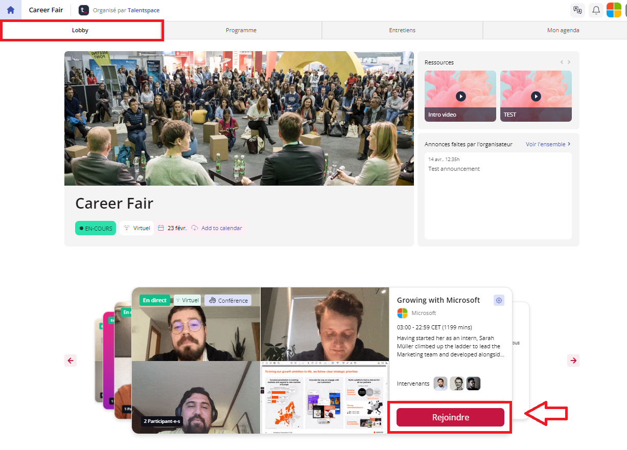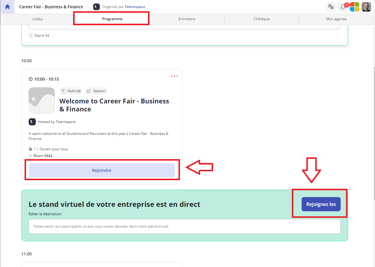 Vous y trouverez votre programme personnalisé avec tous les points du programme, ainsi que les Entretiens confirmés. Cliquez simplement sur "Rejoindre" pour accéder à vos points de programme.